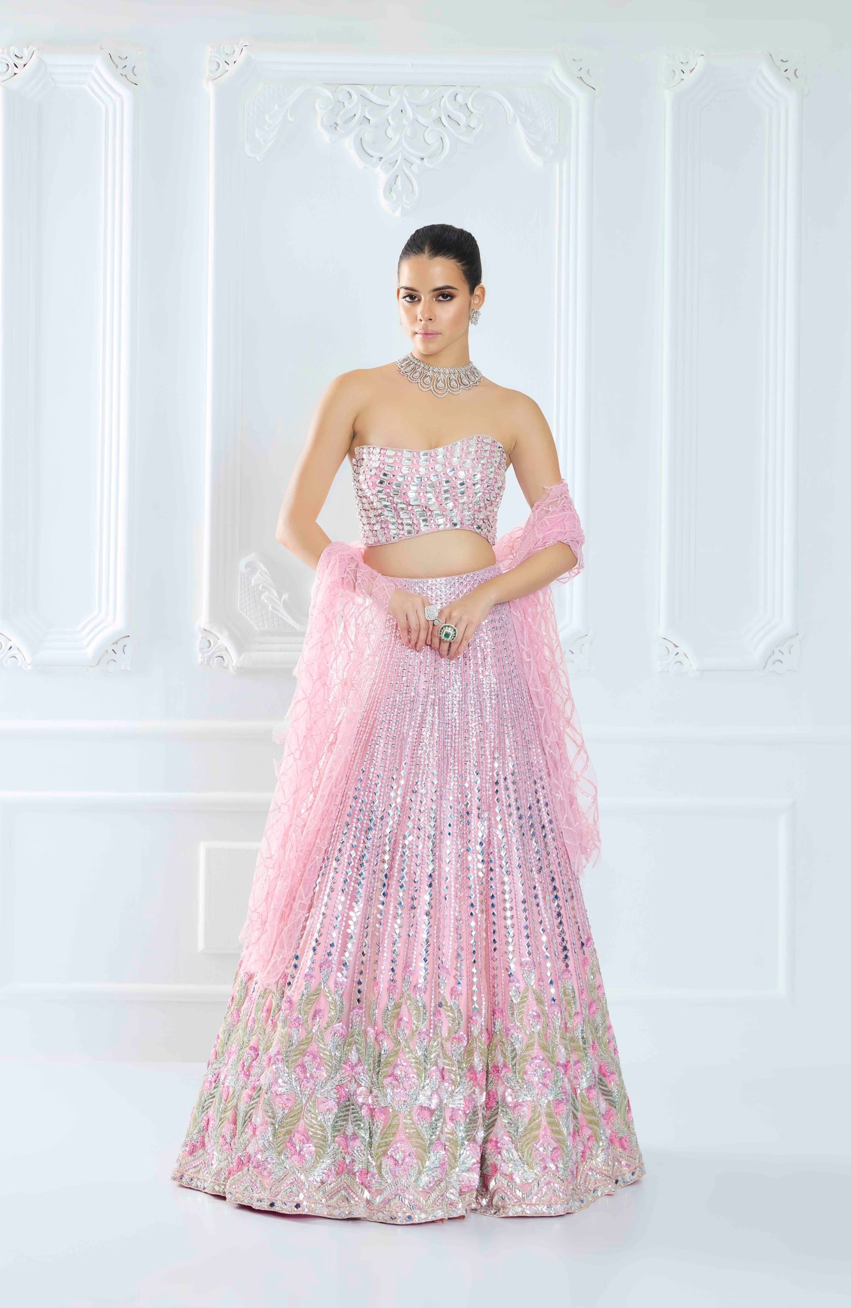 Turn heads in this elegant pink lehenga set, beautifully crafted in floral sequin-embroidered organza. It is paired with a net tube corset, adorned with crystal-studded wave stone detailing for a contemporary twist. A matching dupatta completes the look, making it perfect for weddings, receptions, or festive occasions.